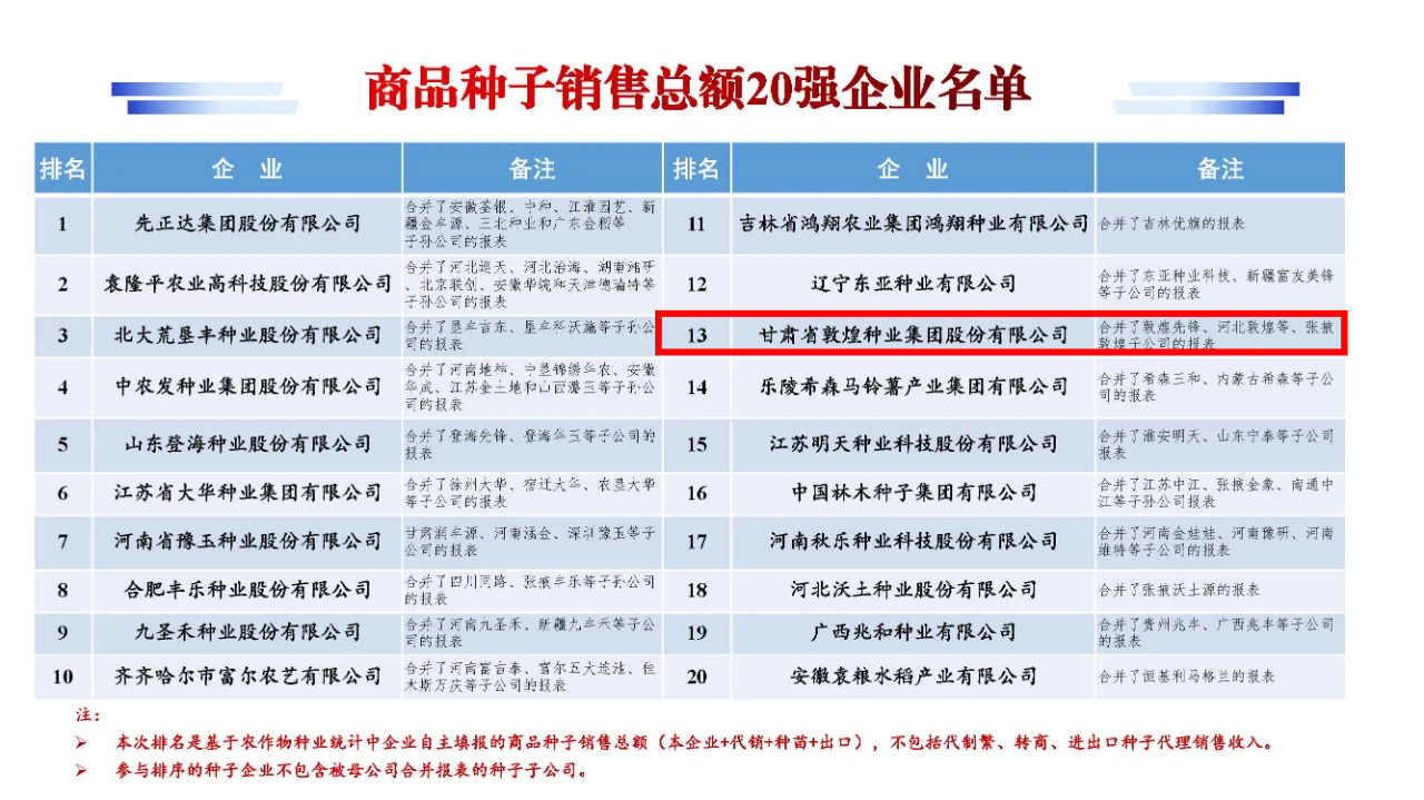 敦煌種業(yè)被第十六屆中國國際種業(yè)博覽會暨第二十一屆全國種子信息交流與產(chǎn)品交易會評為雜交玉米商品種子銷售總額10強(qiáng)企業(yè)、商品種子銷售總..[2024-11-04]